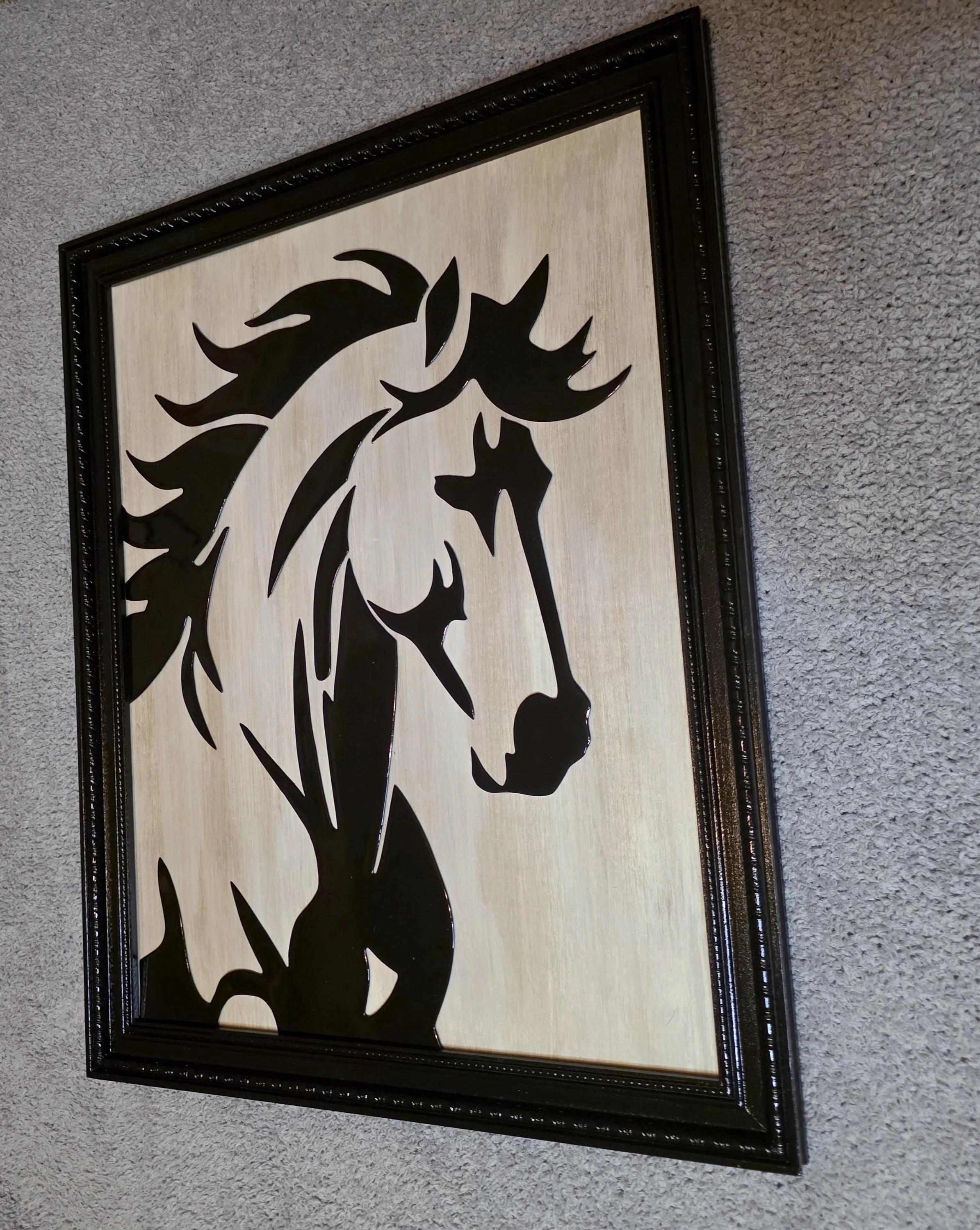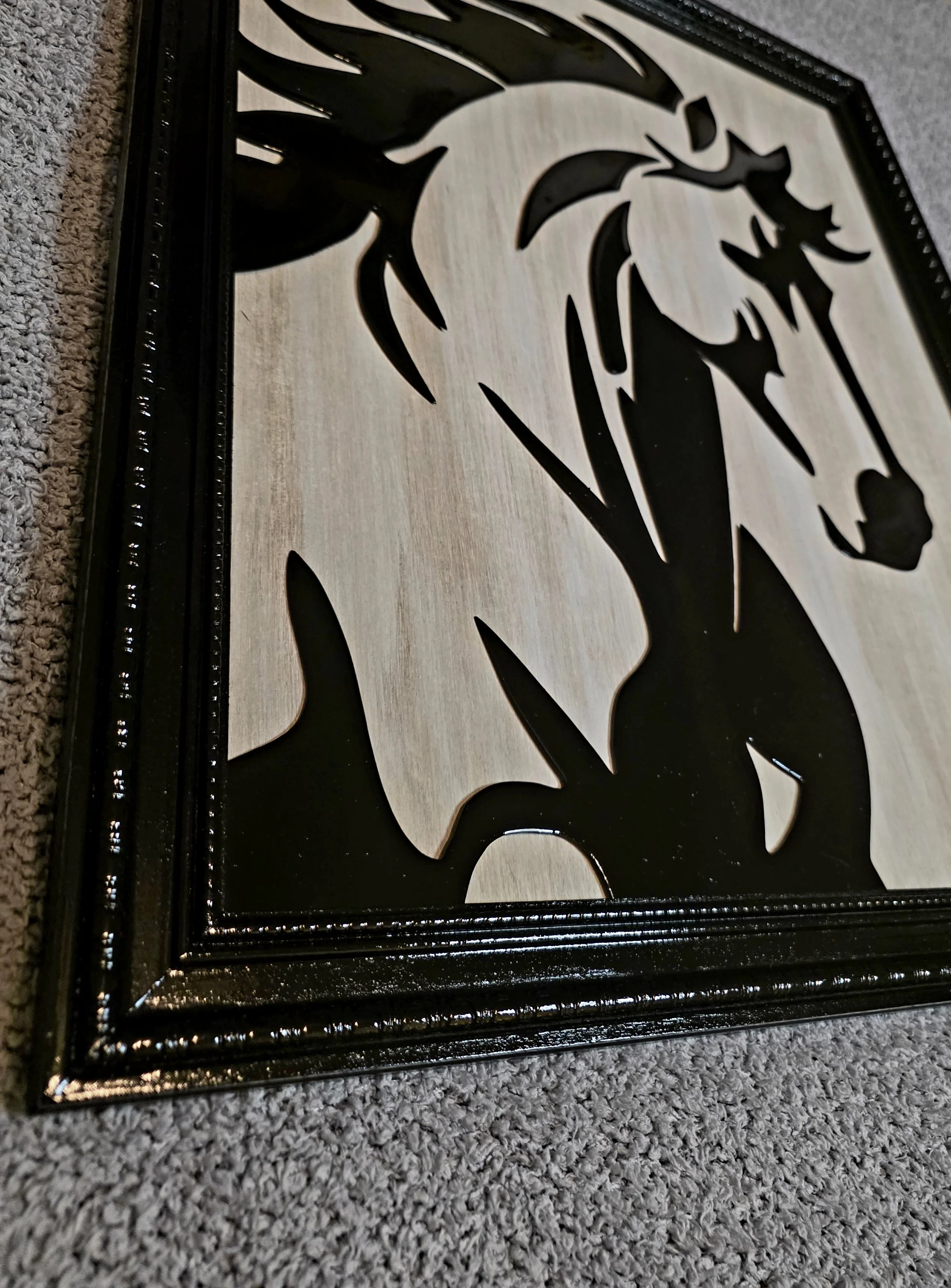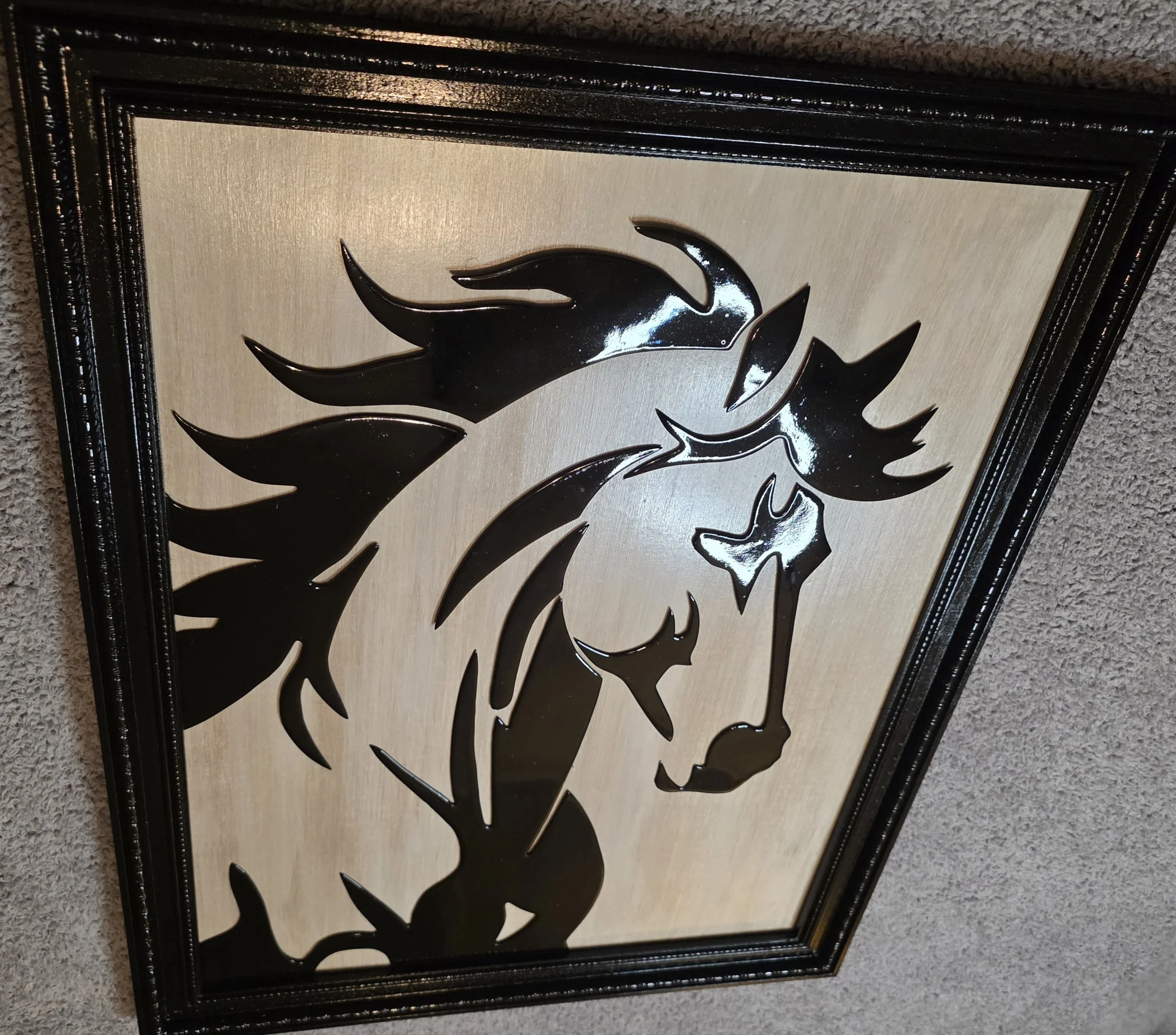Untamed — The horse on a stained blonde wood backing. Finished and complete as it leaves the shop.