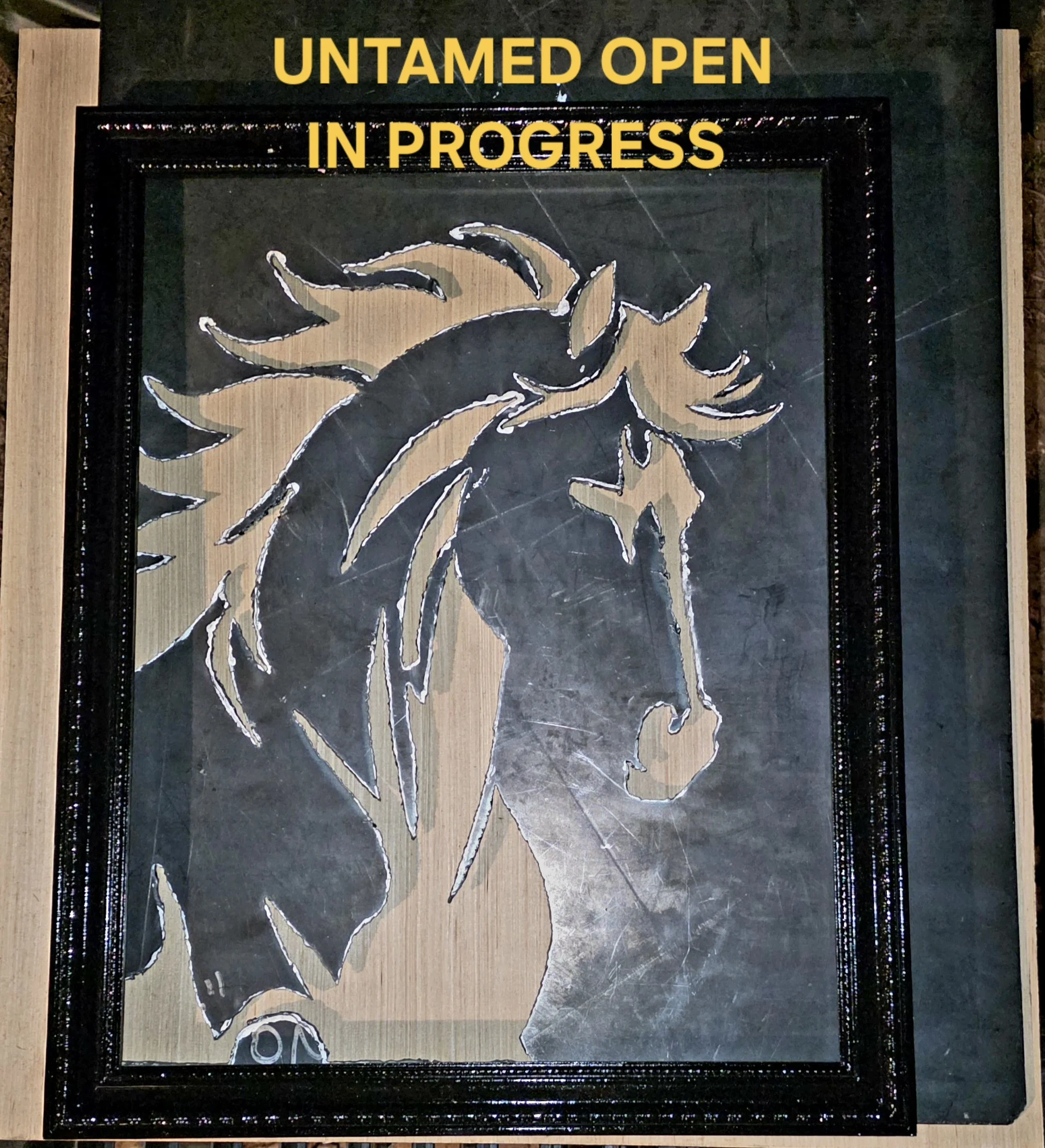 The horse is mid-surge — mane loose, neck arched, caught in the moment before everything breaks loose. Hand cut from raw steel, framed in a custom built black ornate frame. The image doesn't change. The finish and the version is where they split.